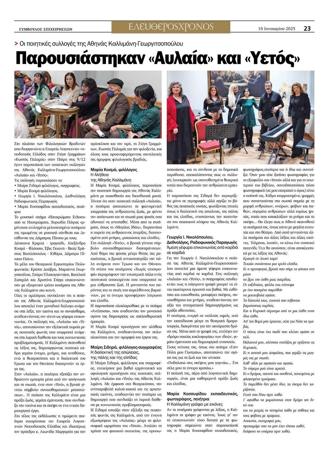 Στο πλαίσιο των Φιλολογικών Βραδινών, που διοργανώνει η Εταιρεία Λογοτεχνών νοτιοδυτικής Ελλάδος στην αίθουσα της Στέγης Γραμμάτων «Κωστής Παλαμάς», παρουσιάστηκαν οι ποιητικές συλλογές της Αθηνάς Καλλιμάνη-Γεωργιτσοπούλου: «Αυλαία» και «Υετός».