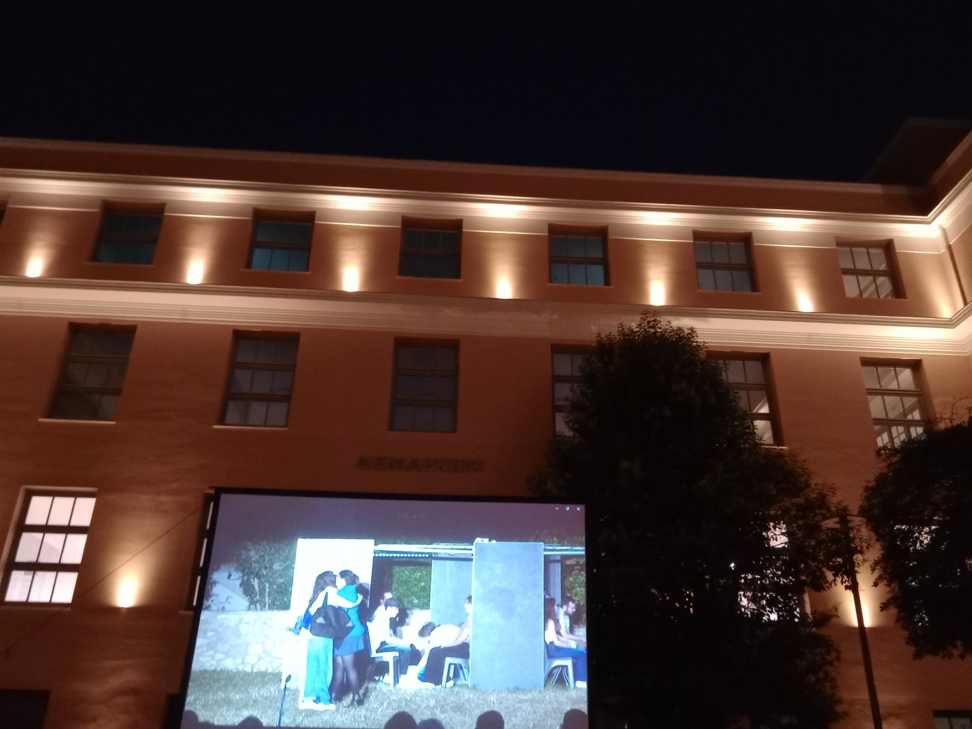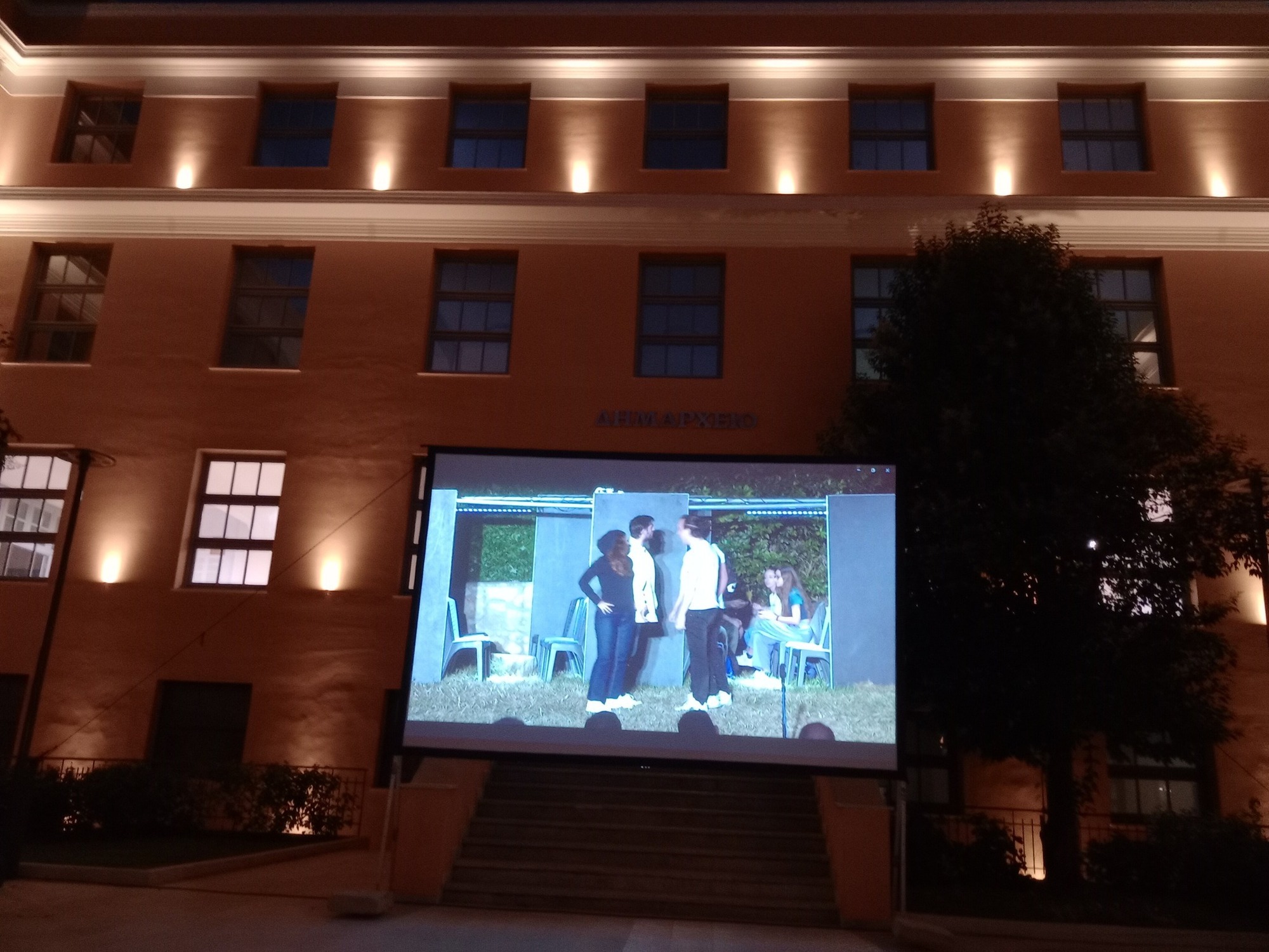 Το κτήριο του νέου Δημαρχείου, με τον ατμοσφαιρικό του φωτισμό, αγκάλιασε την προβολή με έναν σχεδόν ποιητικό τρόπο. Οι φωτεινές αντανακλάσεις στους τοίχους του και το διακριτικό φως που κυλούσε πάνω του έδεναν αρμονικά με τη βαθιά συγκίνηση της βραδιάς. Ο χώρος, λιτός και επιβλητικός ταυτόχρονα, μετατράπηκε σε τόπο μνήμης και συλλογικού συναισθήματος. Δεν ήταν απλώς ένα φόντο, ήταν μέρος της ψυχής της εκδήλωσης.